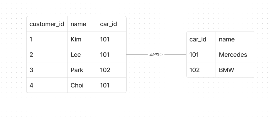 관계형 모델에 대해 처음 접하는 사람들을 위해, 빠르고 쉽게 이해할 수 있도록 장단점과 특징을 설명한 게시물로, 깊은 전문지식과는 거리가 멀 수 있습니다. 관계형 모델 관계형 모델은 테이블 형태로 데이터를 관리하는 모델이다. (tabular view) 행과 열로 이루어져 있으며, 행은 record (데이터 단위) 열은 record의 속성 (attribute 라고도 불림)으로 구성된다. 테이블끼리는 "관계(relationship)"로 서로 연결된다. 위 그림은, 이해를 위해 그린 그림이다. ERD모델과는 다름. 각 테이블로 나누어 데이터를 저장하고, releationship을 통해서 연결된다는 특징을 설명하기 위함이다. 장점 (사람이 쓰기 편함) 구조 독립성 만족 (계층형 모델, 네트워크 모델, 파일시스템..